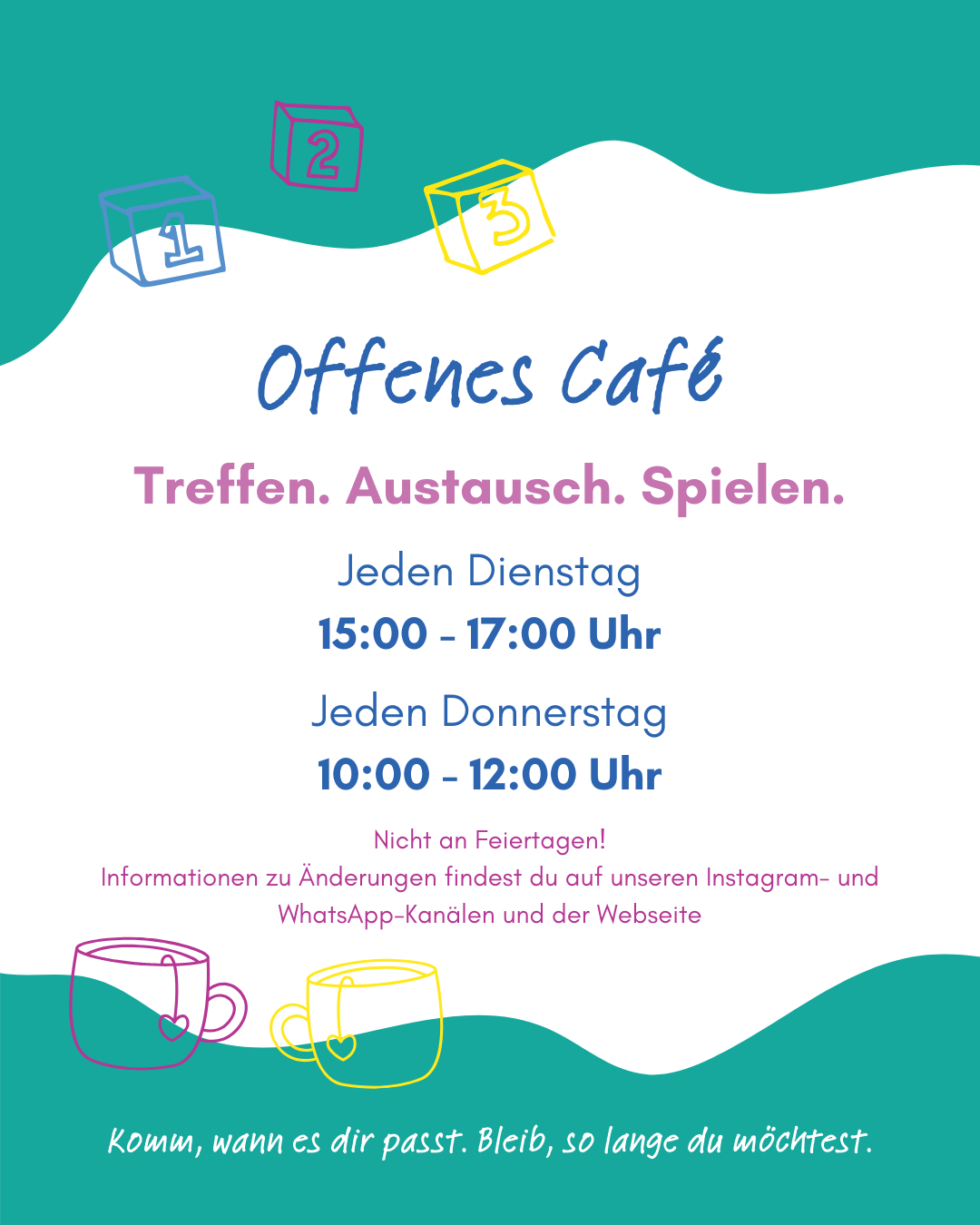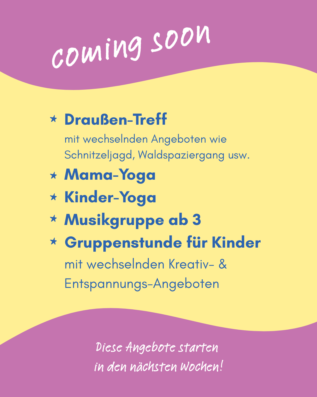 Wir starten in den nächsten Wochen viele neue Angebote: Einen Draußen-Treff, eine Gruppenstunde für Kinder, Yoga-Kurse und vieles mehr. Alle Infos findest du unten bei "Programm".
